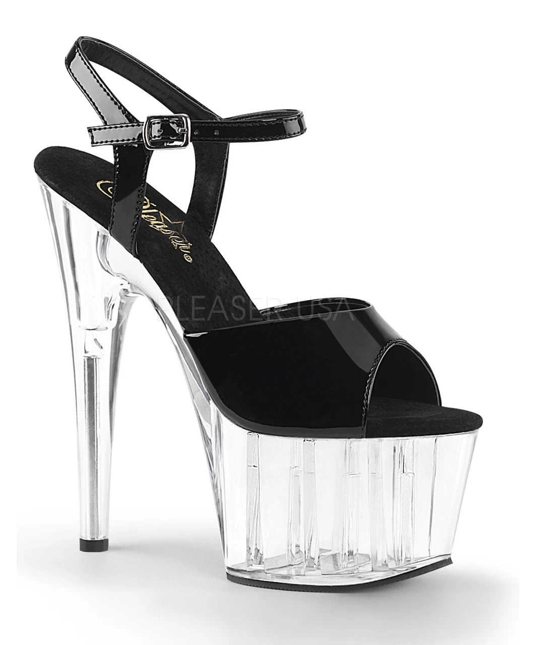 Clear platform shoes with black straps and black soft inner sole.