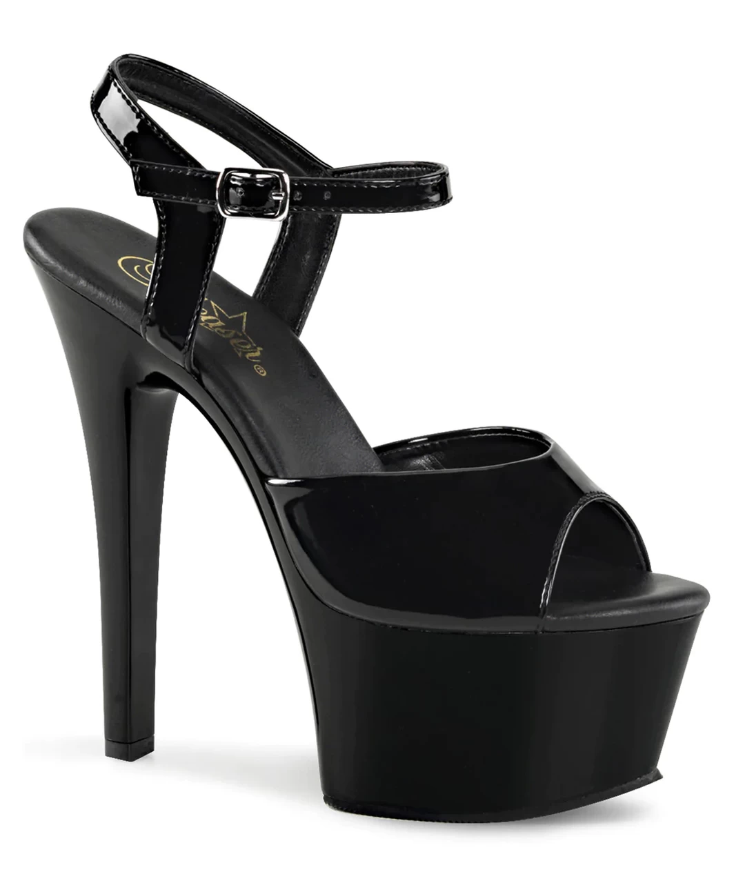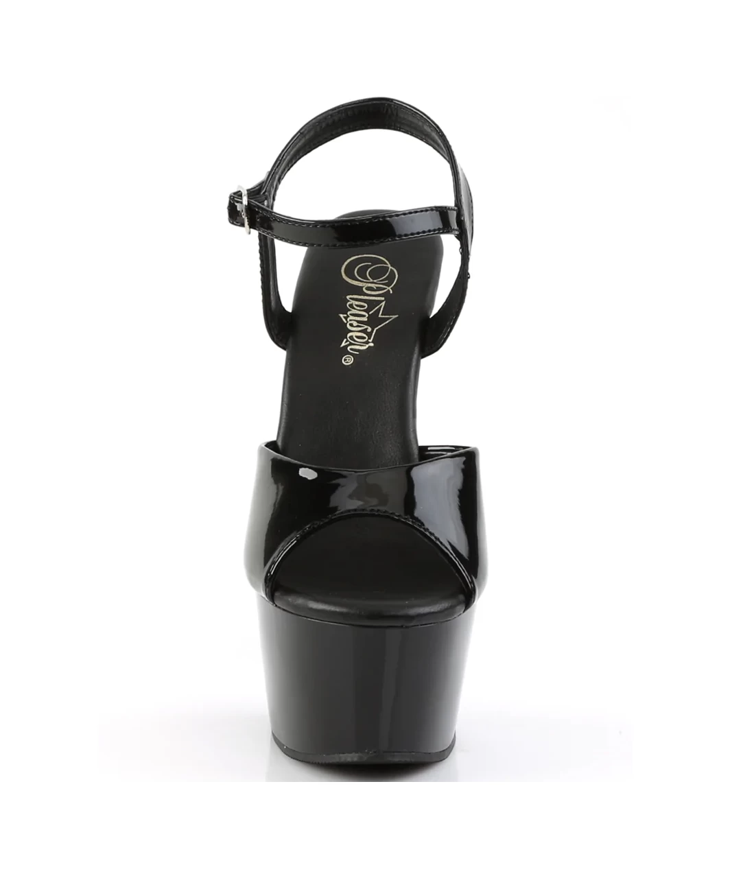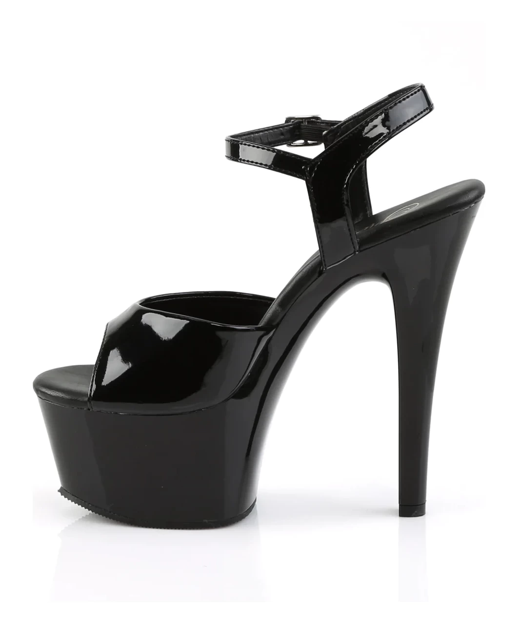 Black laquered patent open toe ankle strap sandals with high platform, stiletto heel and leatherette insole.
