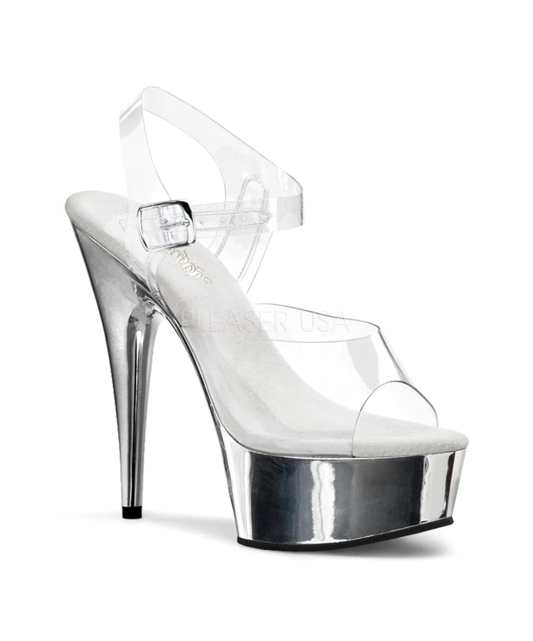 Metalic platform sandals with clear ankle strap and wide top strap with front square cut-out detail and white soft inner sole.