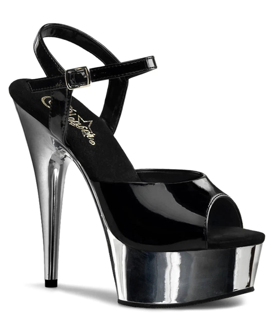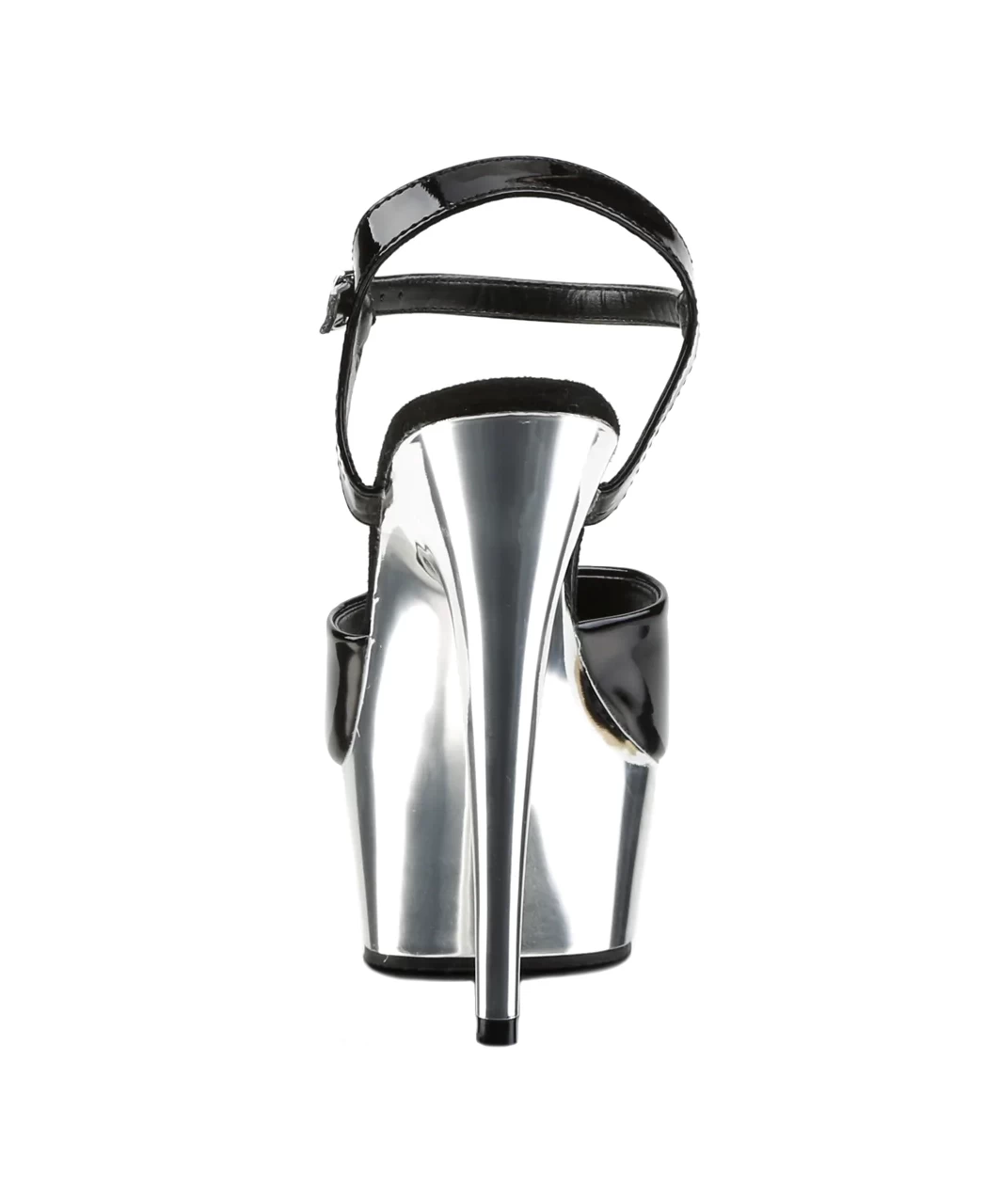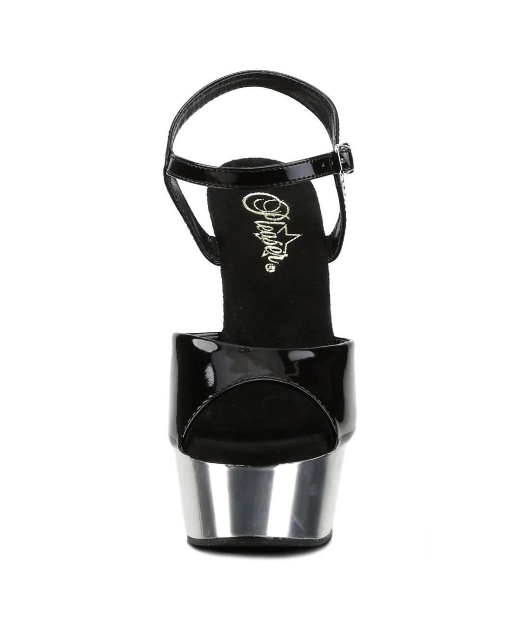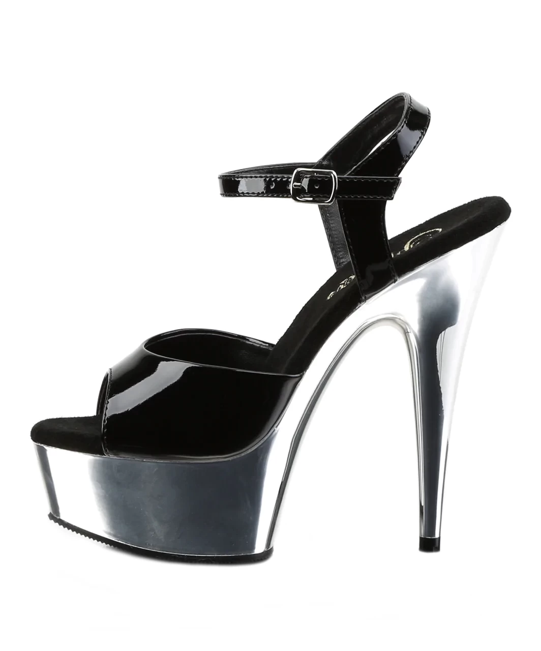 Black lacquered patent open toe ankle strap sandals with silver chrome plated platform, stiletto heel and microfiber insole.
