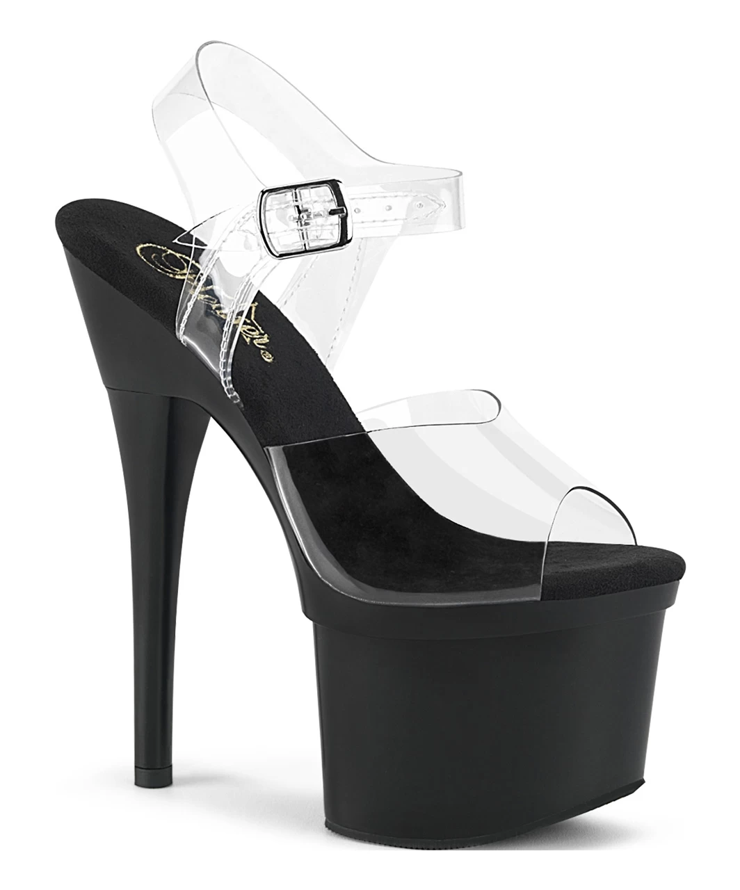 Transparent vinyl open toe ankle strap sandals with high black platform, stiletto heel and microfiber insole.