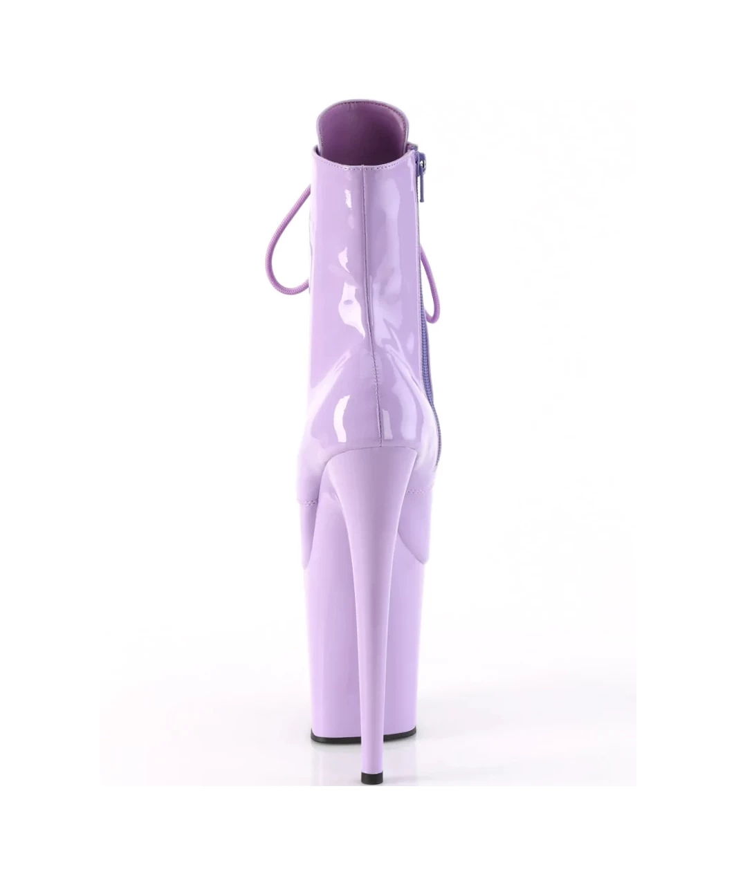 Lavender lacquered patent lace-up ankle boots with extra high platform, stiletto heel, vinyl insole and full inner side zipper.