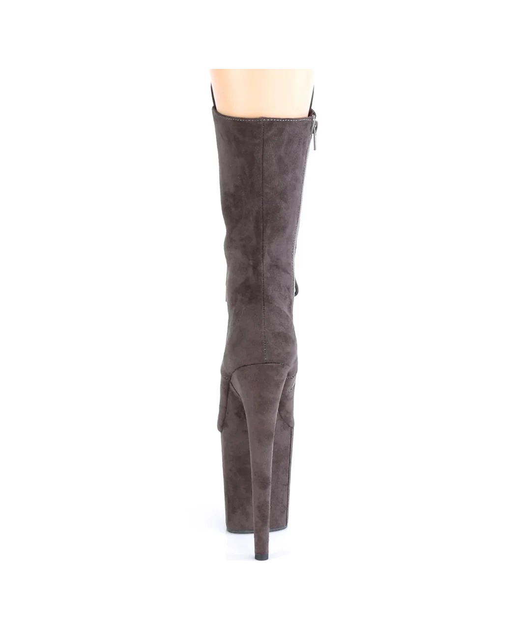 Grey faux suede lace-up ankle boots with extra high platform, stiletto heel, vinyl insole and full inner side zipper.