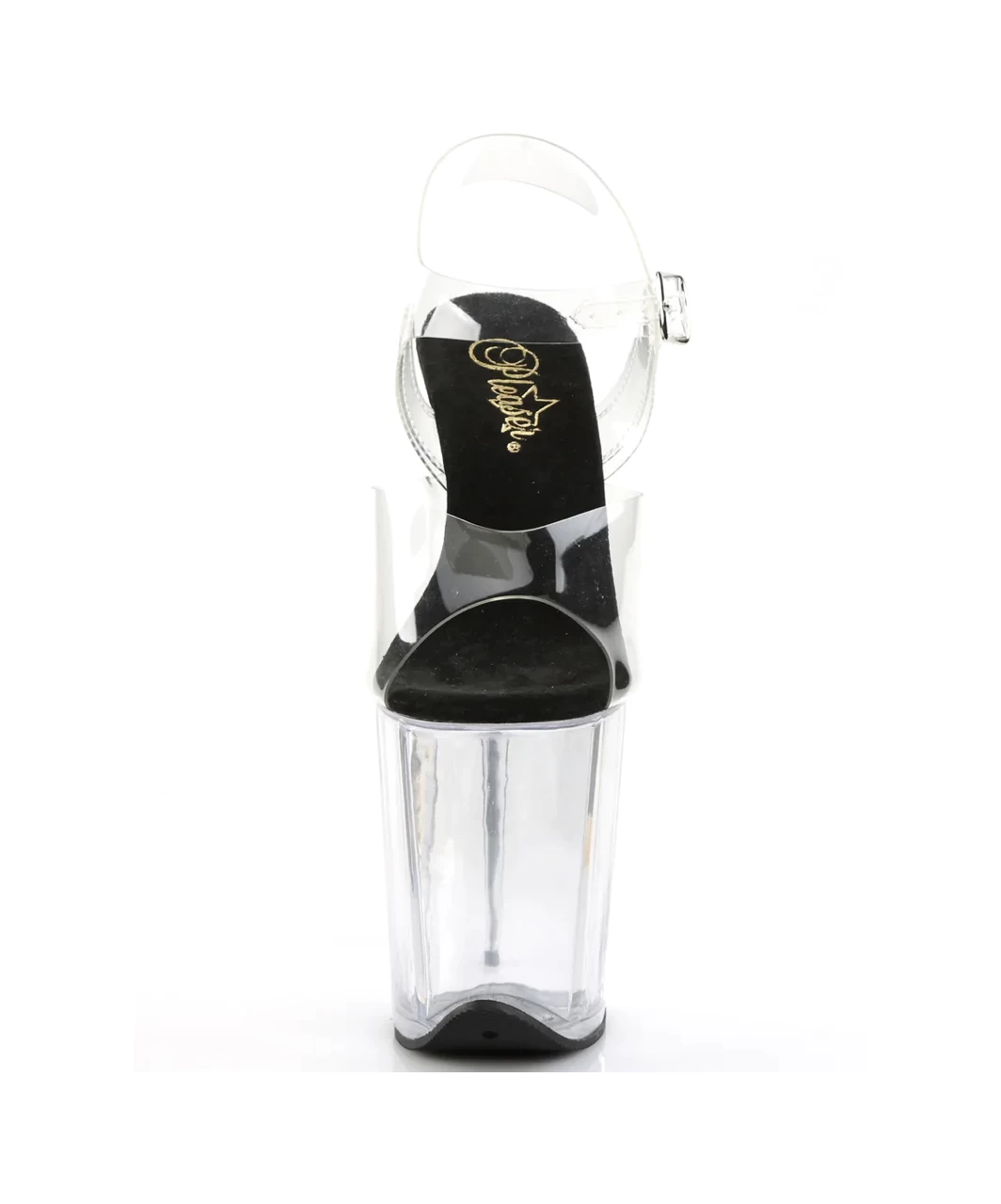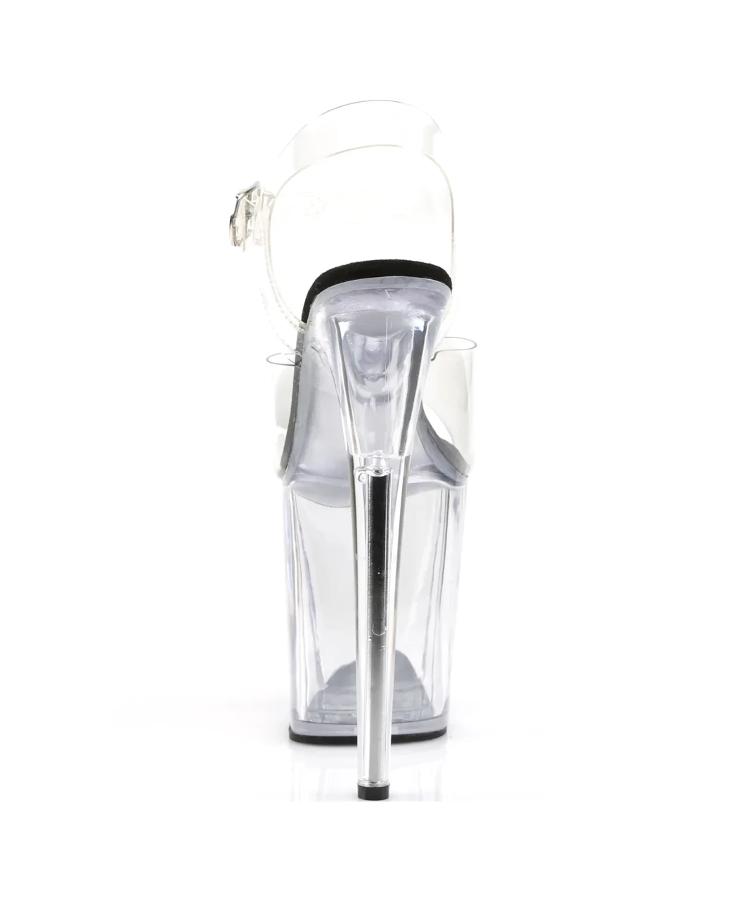 Transparent vinyl open toe ankle strap sandals with extra high platform, stiletto heel and black microfiber insole.