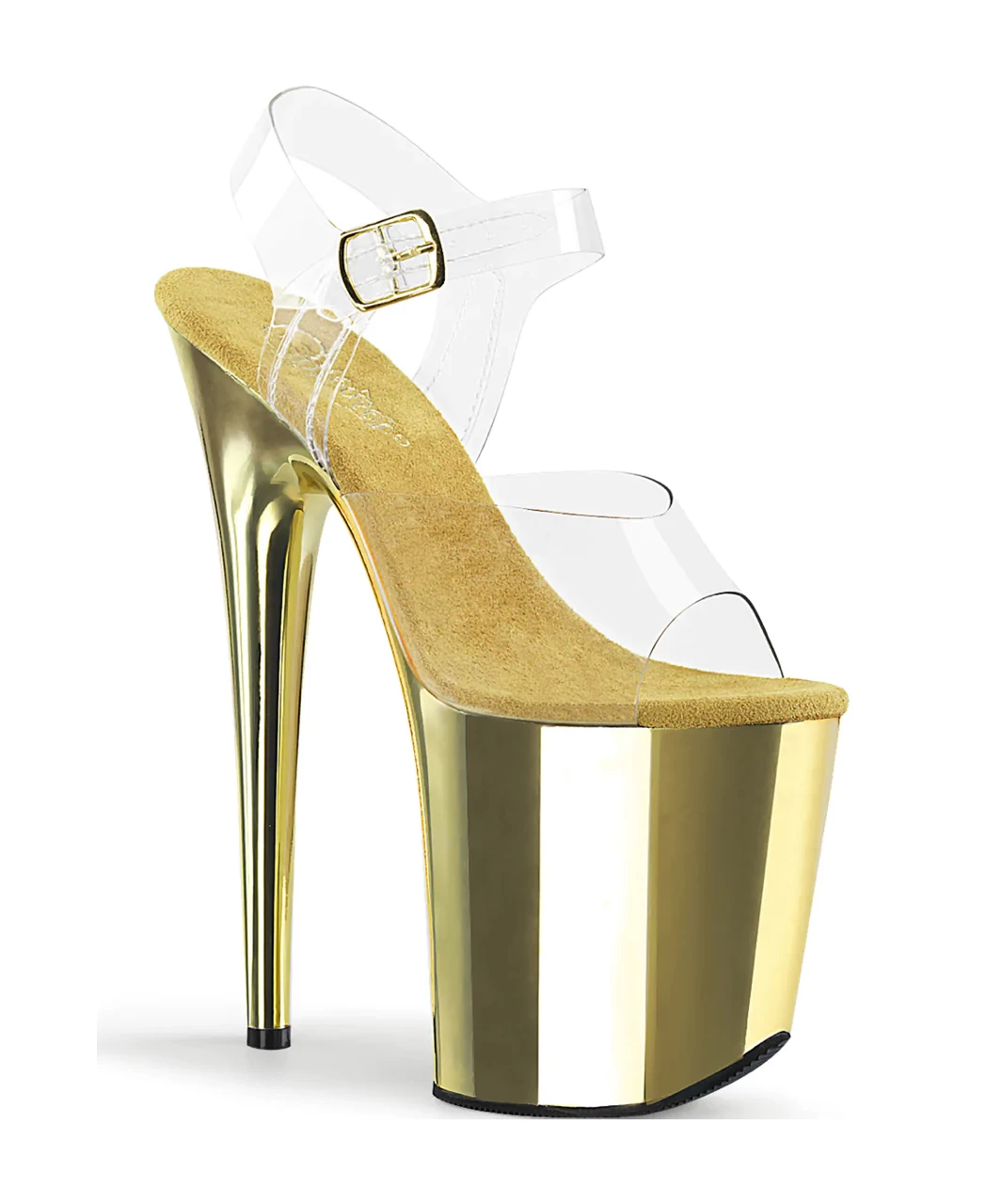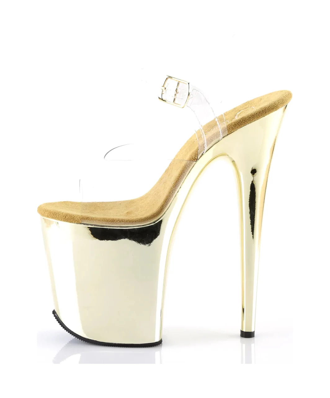 Transparent vinyl open toe ankle strap sandals with extra high gold chrome plated platform, stiletto heel and black microfiber insole.