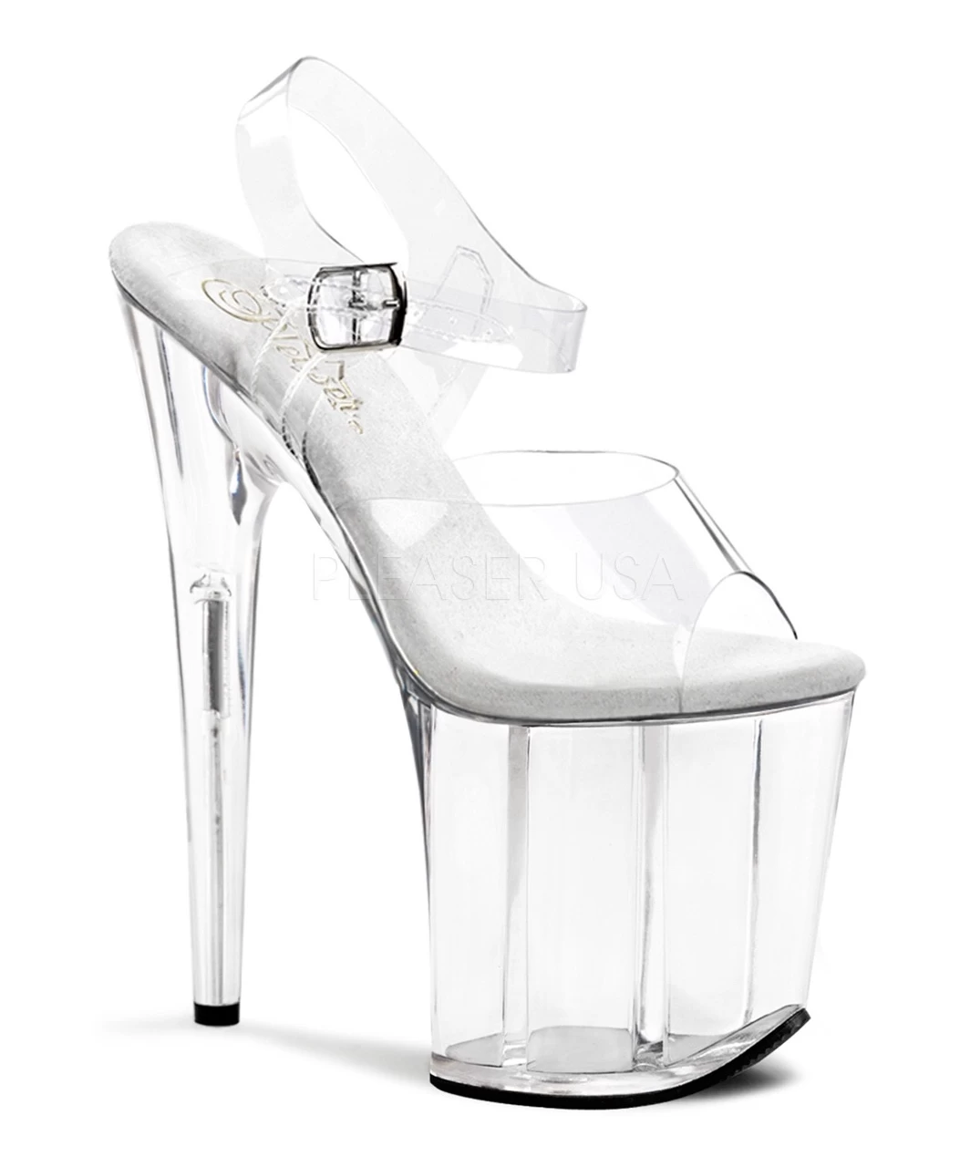 Clear platform sandals with clear ankle strap and wide top strap with front square cut-out detail, white soft inner sole.