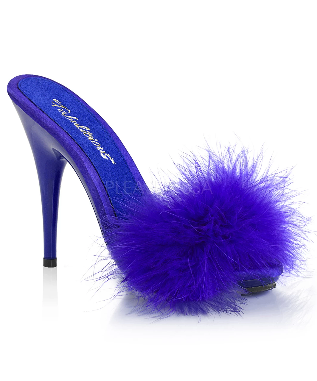 Blue shoes, with stiletto heel and fluffy open toe strap.