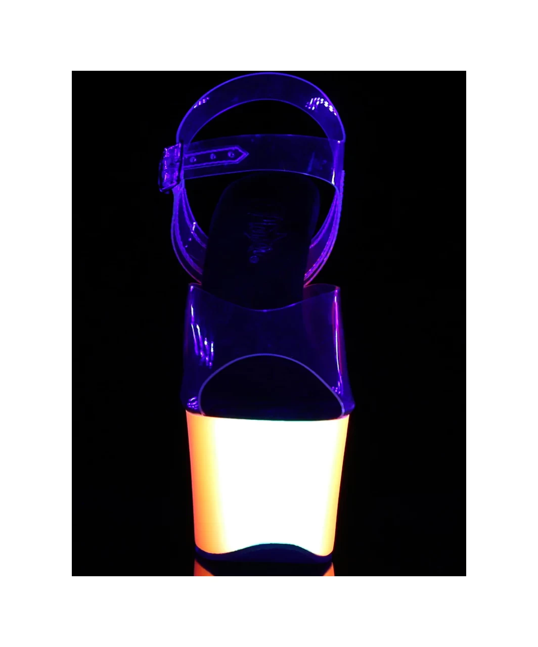 Transparent vinyl open toe ankle strap sandals with high neon UV reactive multicolored platform, stiletto heel and black microfiber insole.