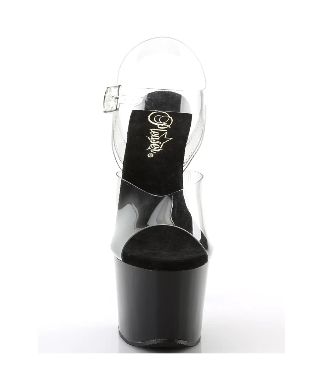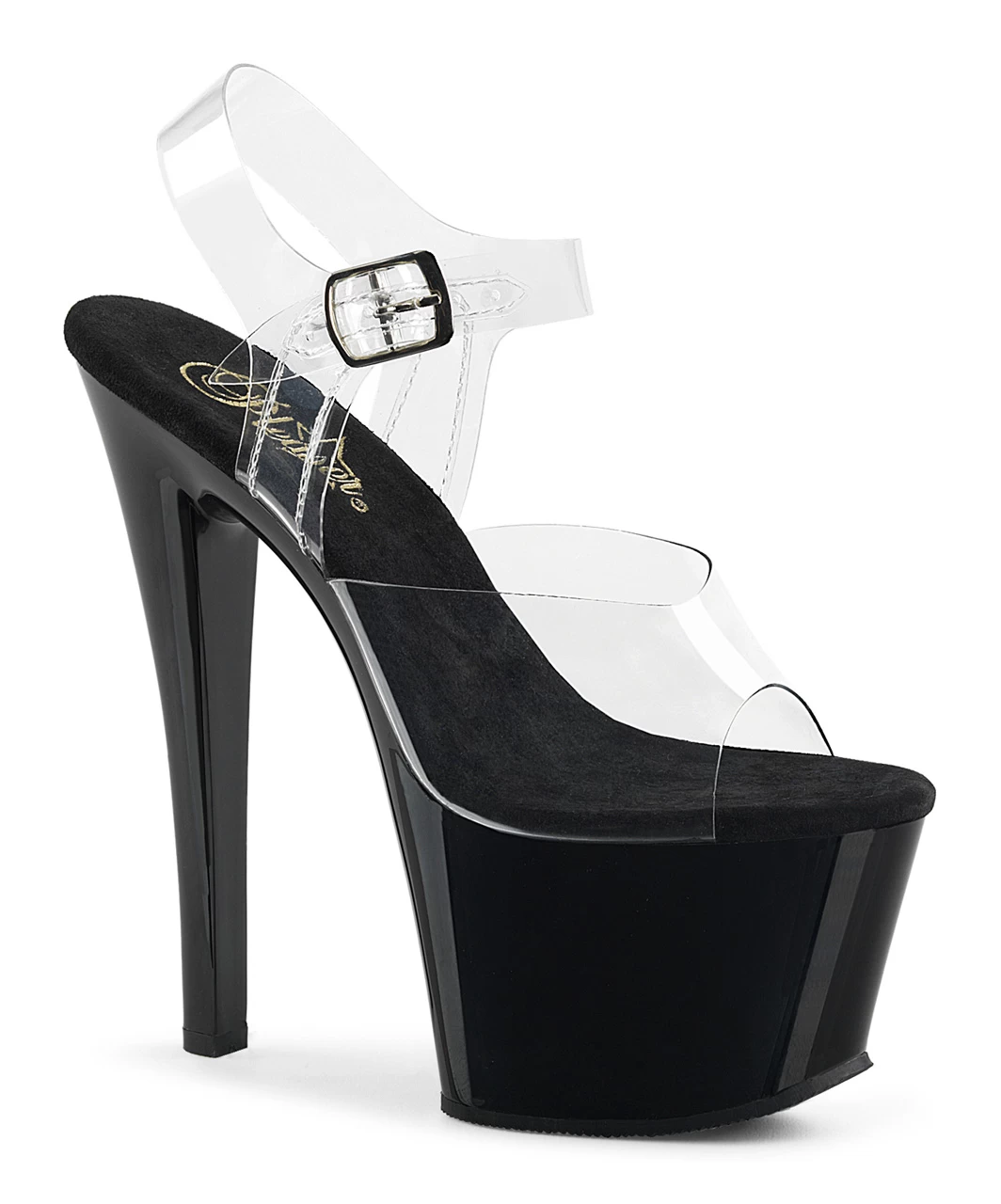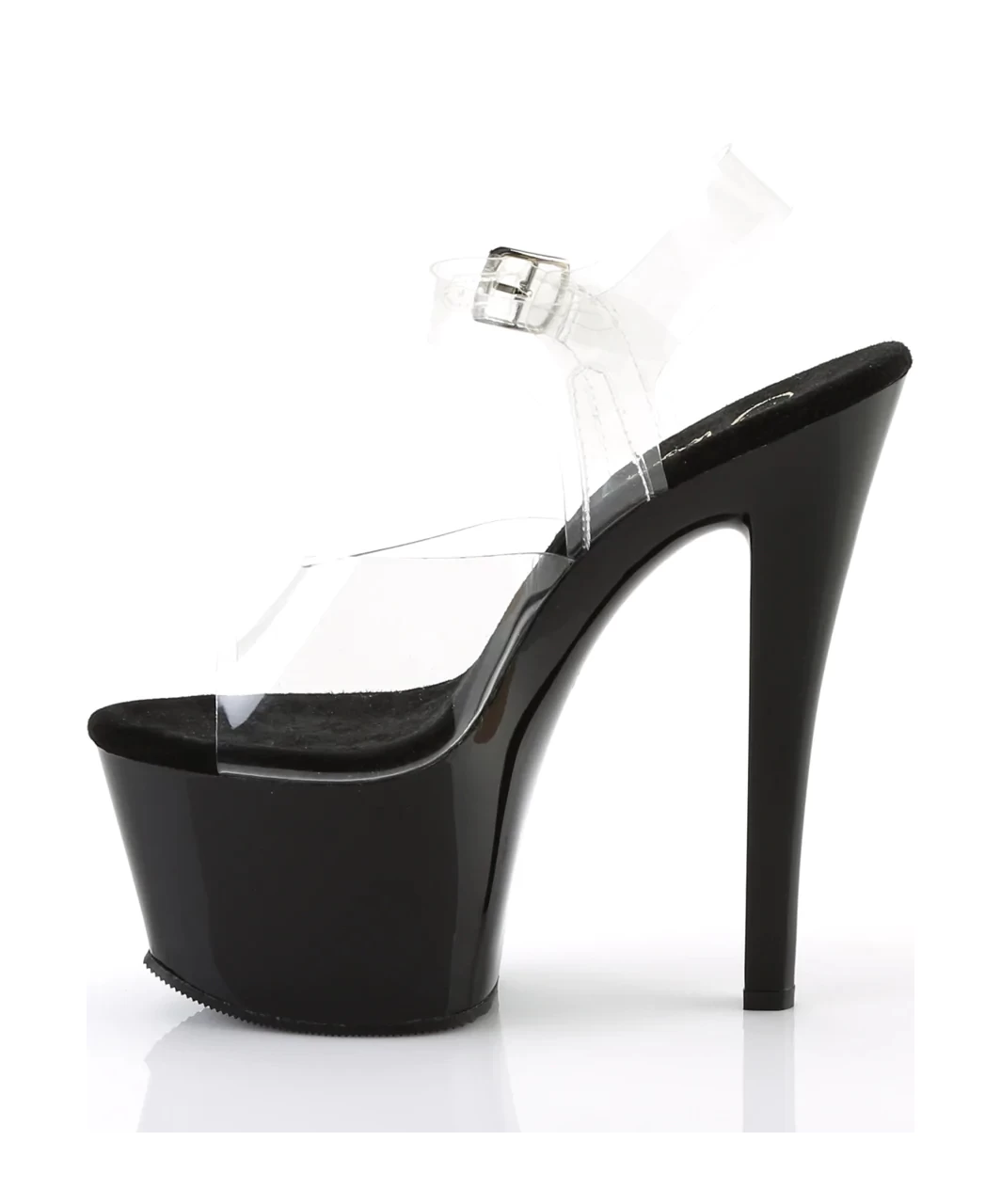 Transparent vinyl open toe ankle strap sandals with high black platform, stiletto heel and microfiber insole.