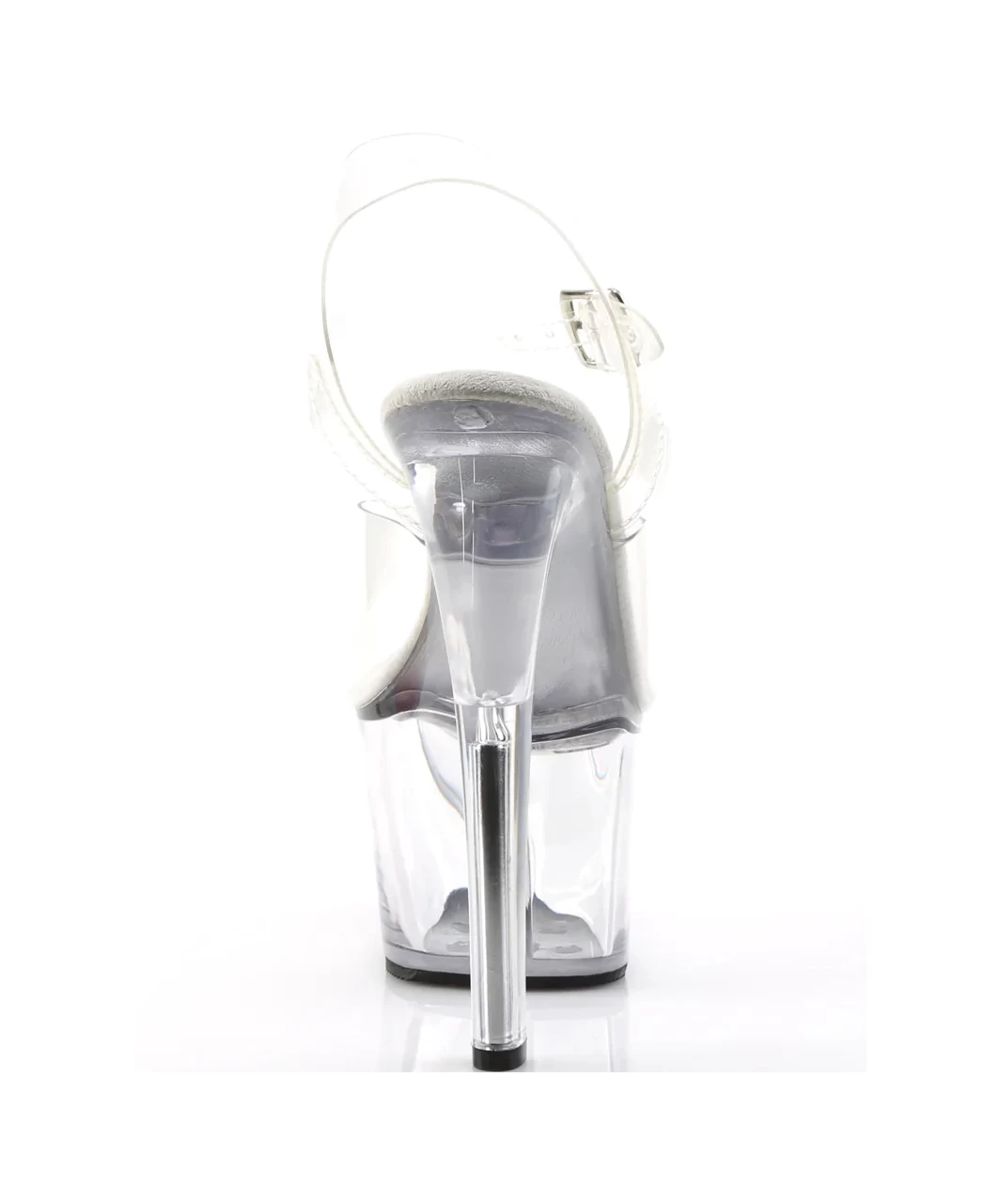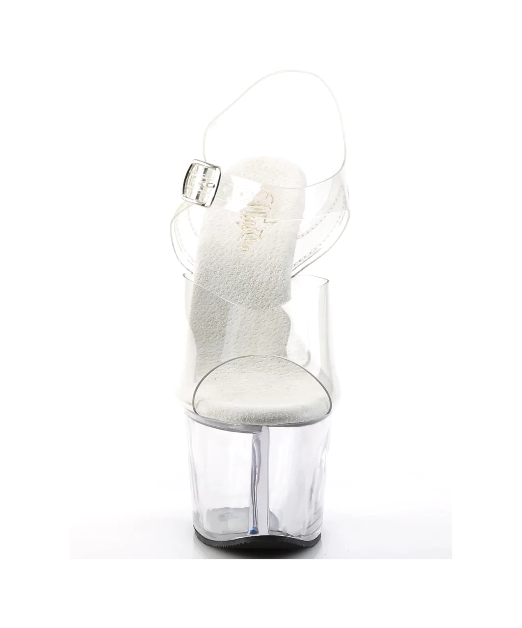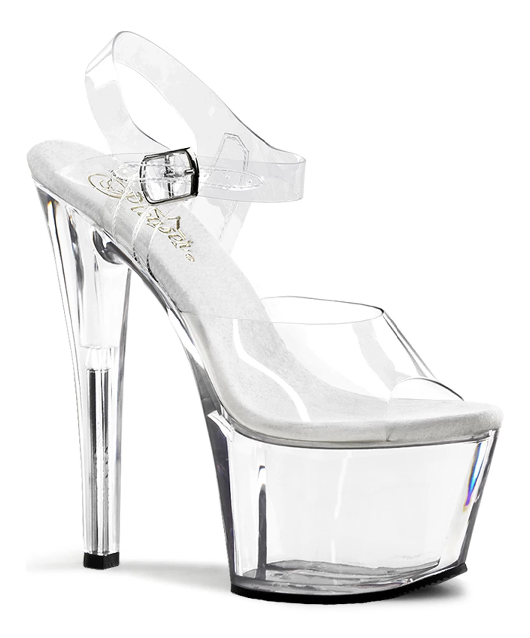 Transparent vinyl open toe ankle strap sandals with high platform, stiletto heel and microfiber insole.