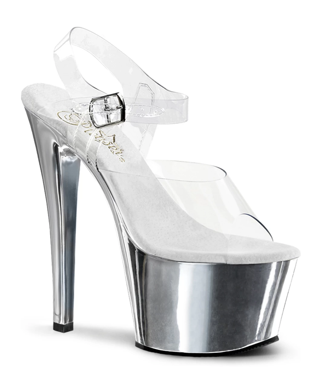 Transparent vinyl open toe ankle strap sandals with high silver chrome plated platform, stiletto heel and microfiber insole.