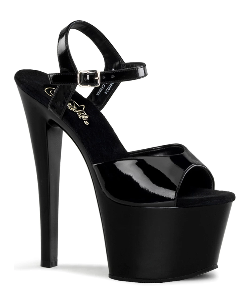 Black lacquered patent open toe ankle strap sandals with high platform, stiletto heel and microfiber insole.