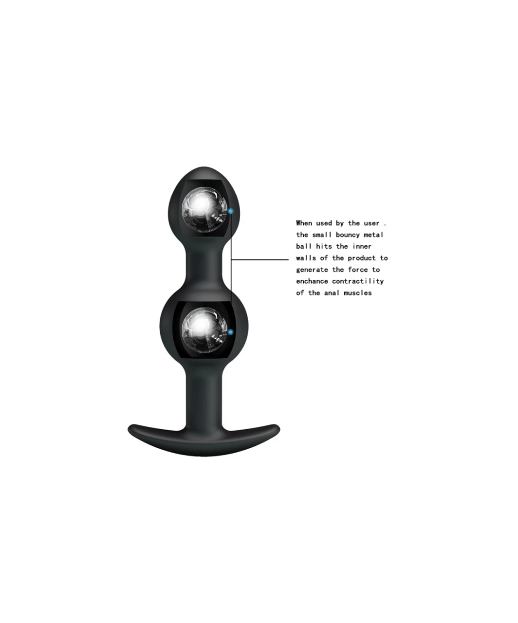 Black silicone anal plug with inner balls for maximum pleasure. Total length 10.5 cm. Ø 2.5 – 3.2 cm.