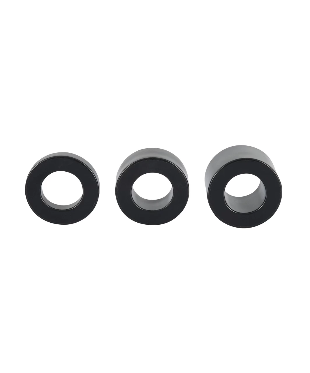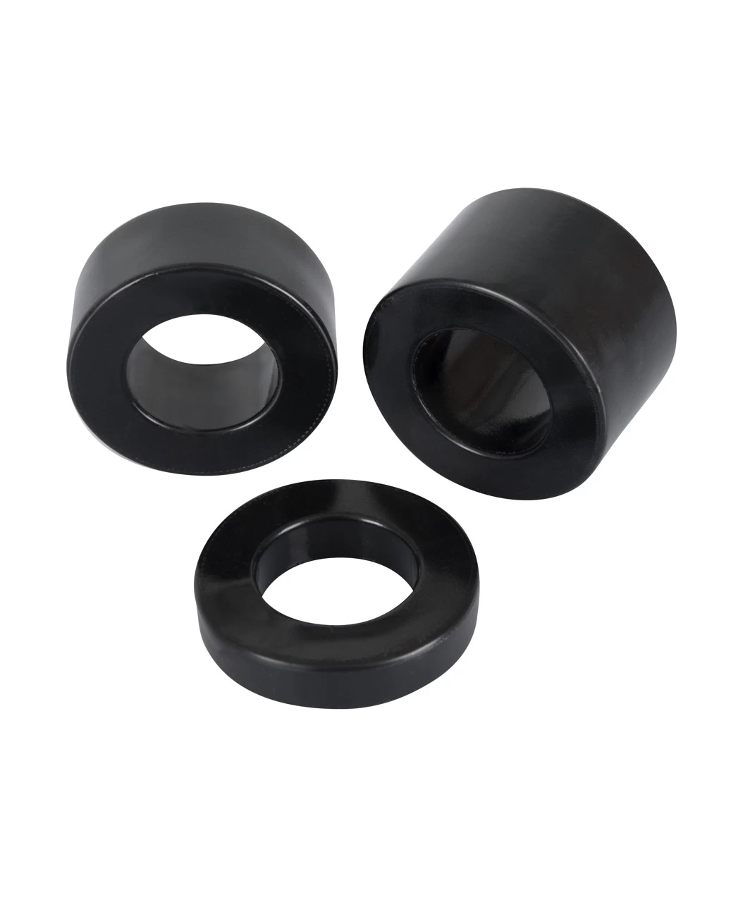 All three black rings have an inner Ø of 2.5 cm (flexible) and a thickness of 1 cm. The first ring is 1 cm wide (high), the second ring is 2 cm wide (high) and the third ring is 3 cm wide (high).