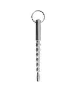 Penis plug with a bead structure in the middle. Insert it into the man´s urethra and direct it with the handle. The plug is hollow and all fluid types can trickle into it with no restriction. Silver coloured. Insertion depth 13 cm, plug-Ø 0.6 cm-1.2 cm. Material: stainless steel.