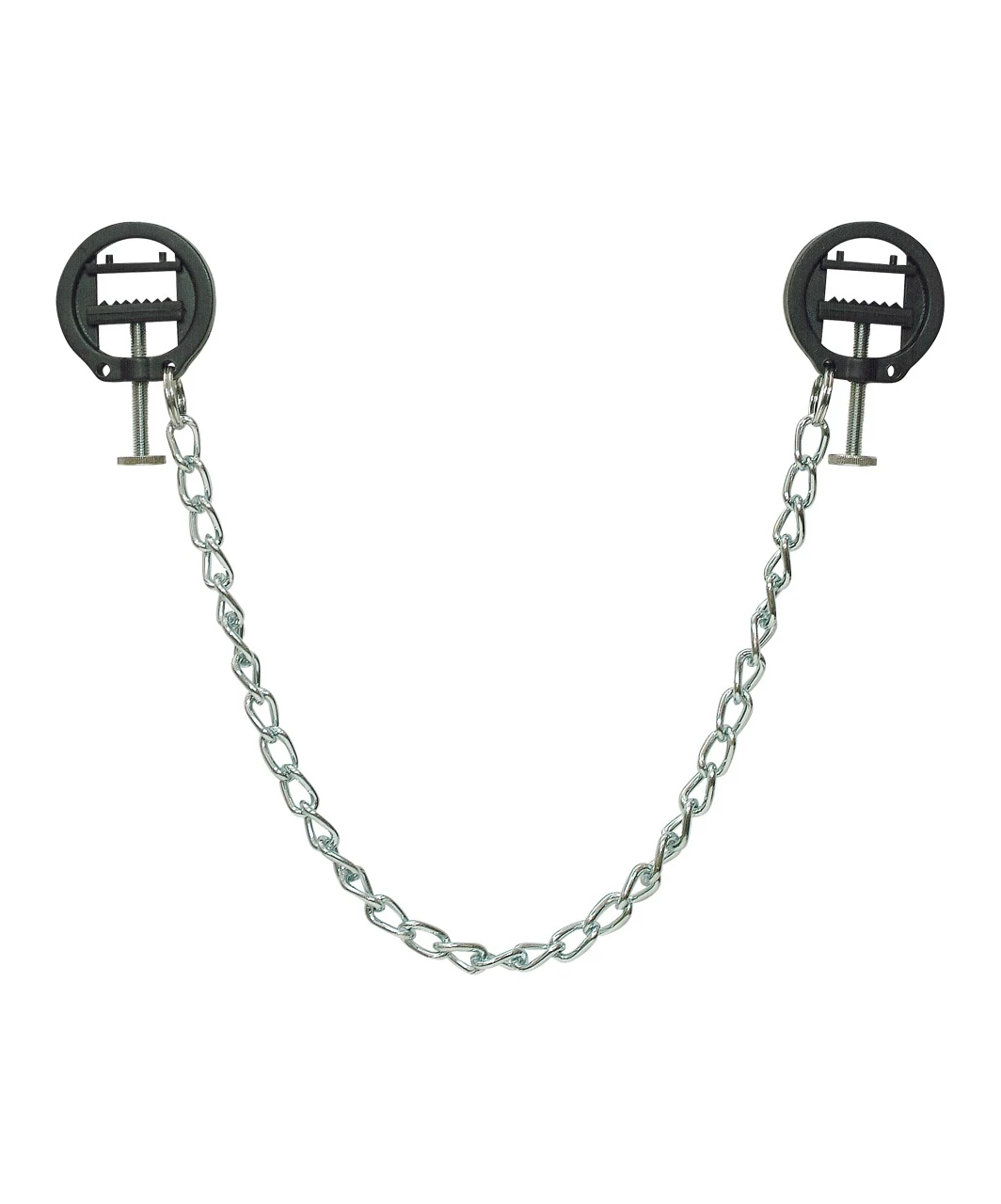Two black, round nipple screw clamps attached to a 33 cm light metal chain. Clamp pressure individually adjustable with screw.