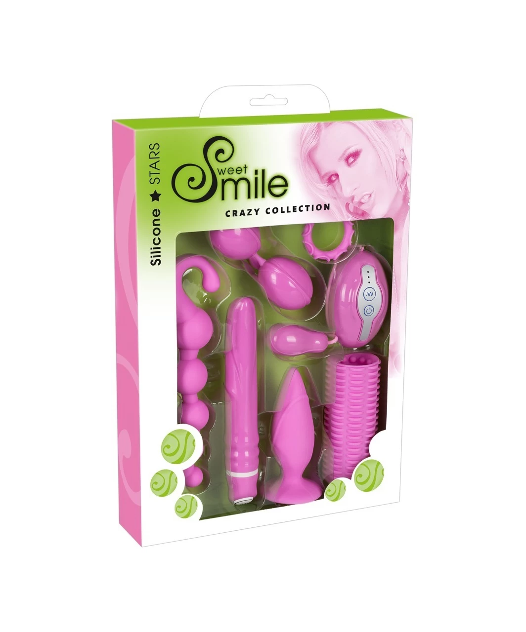 7-piece kit! Content: 7-level vibe bullet and vibrator, love balls, anal beads, anal plug with suction cup, cock ring, inside-outside use sleeve (dots/grooves). Pink. Material: Silikon, ABS. Batteries included.