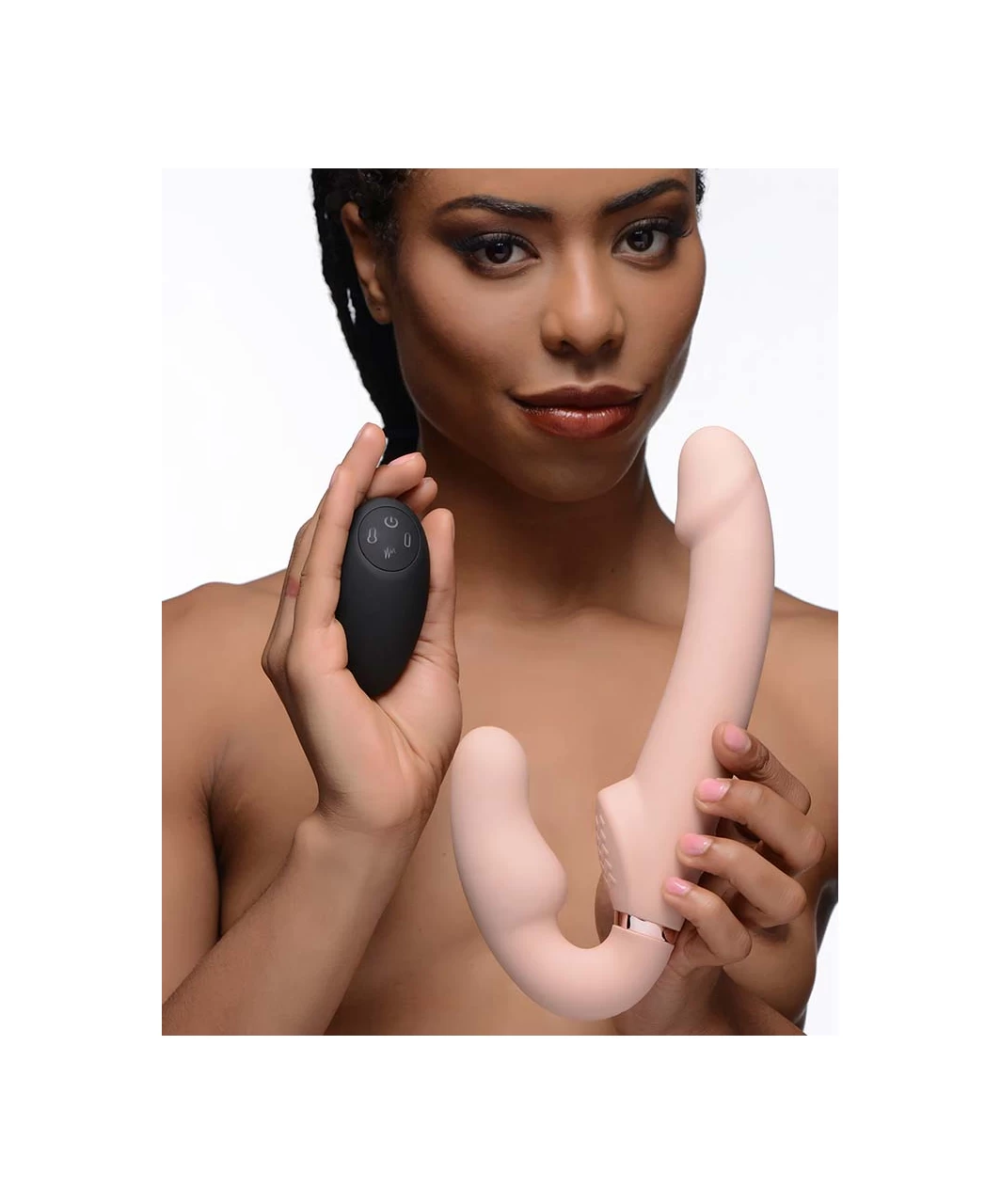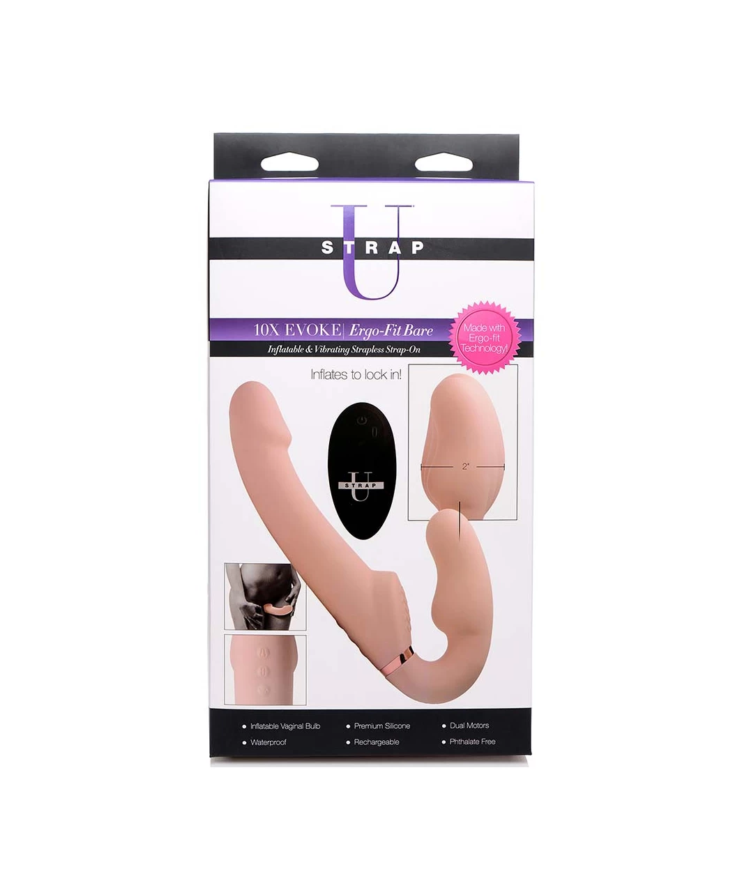 Perfect for penetrating a male or female body, this remote-controlled strapless strap-on features extreme vibration and an inflatable vaginal bulb to create the perfect fit for your body. The shape allows one partner to insert the smaller end vaginally, holding it with their kegel muscles or adding a harness for extra support. However, this unique model of strapless strap-on also has an inflating bulb to lock in place, as well as apply greater pressure inside.