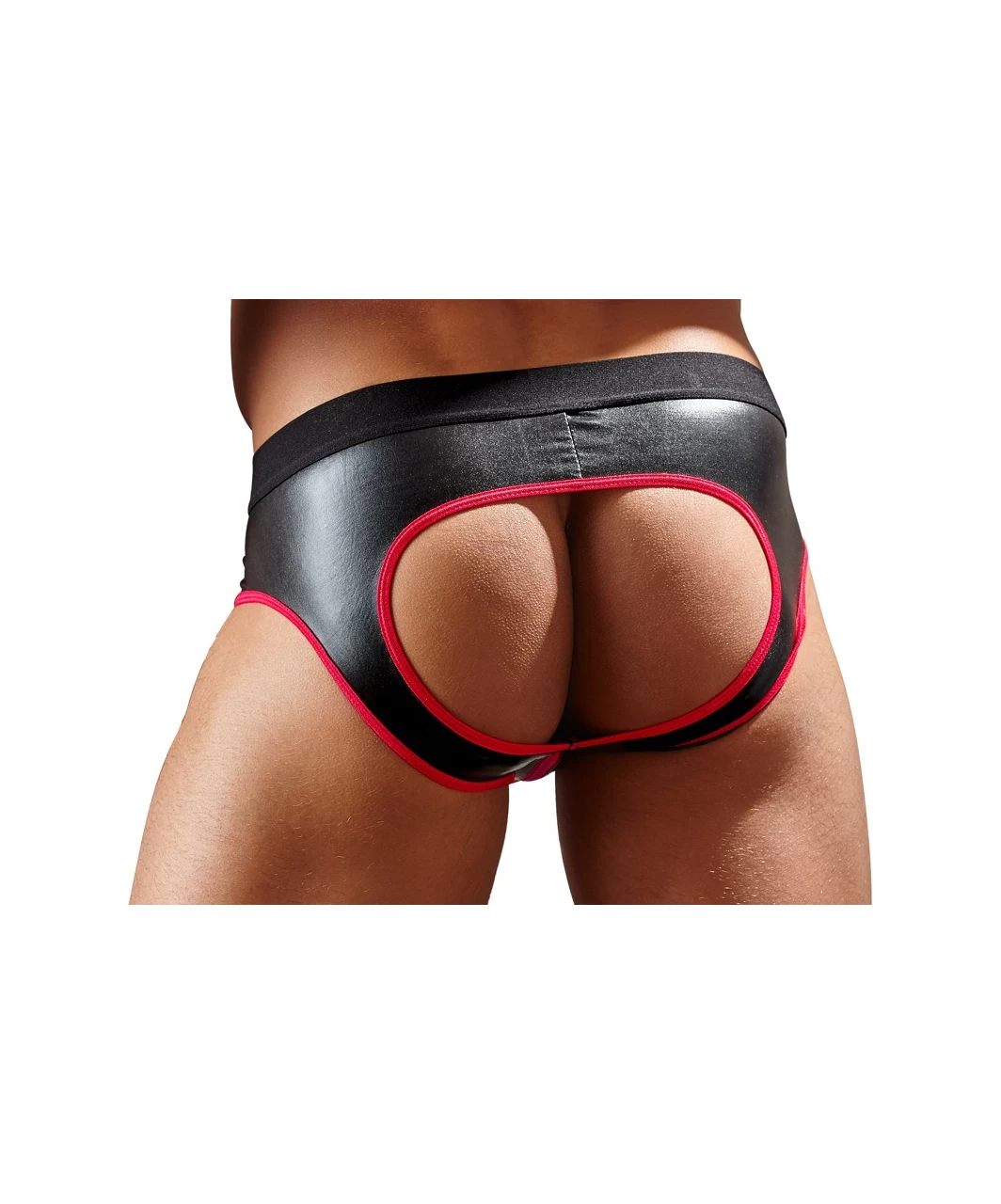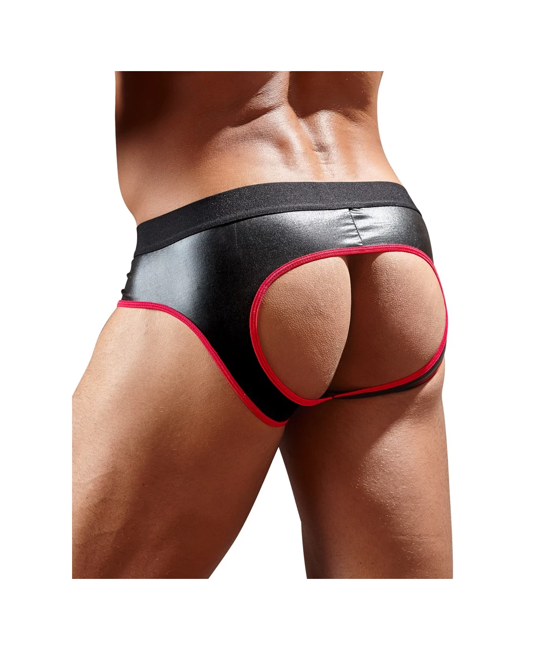 Black matte neoprene rubber look jock with a front zipper. Accentuated with a red edging.