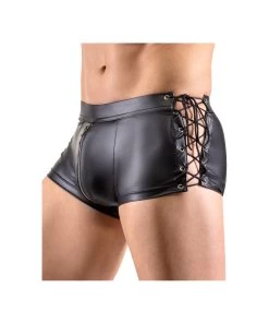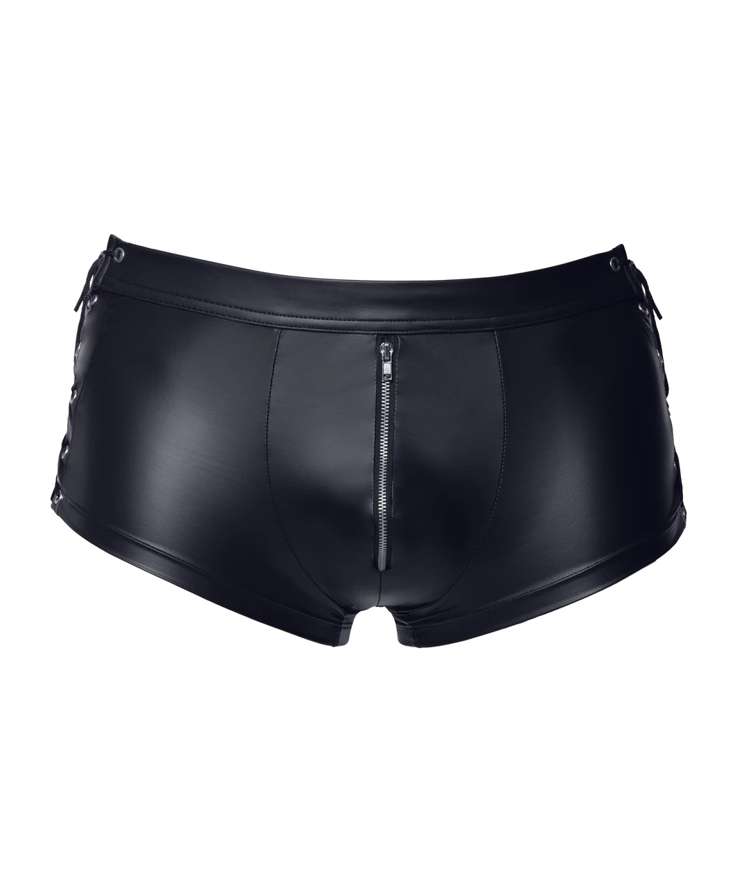 Tight-fitting black matte look trunks with accentuated zipper pouch and side lacing.