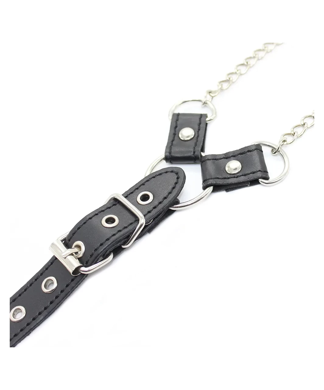 Nipple clamps chained to adjustable leatherette strap with the metal cock ring. The tips of nipple clamps has vinyl caps.