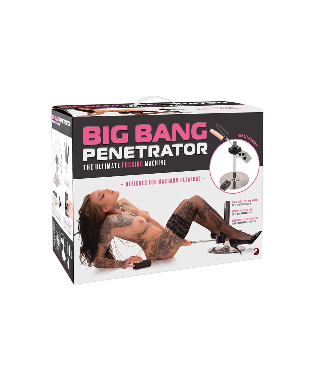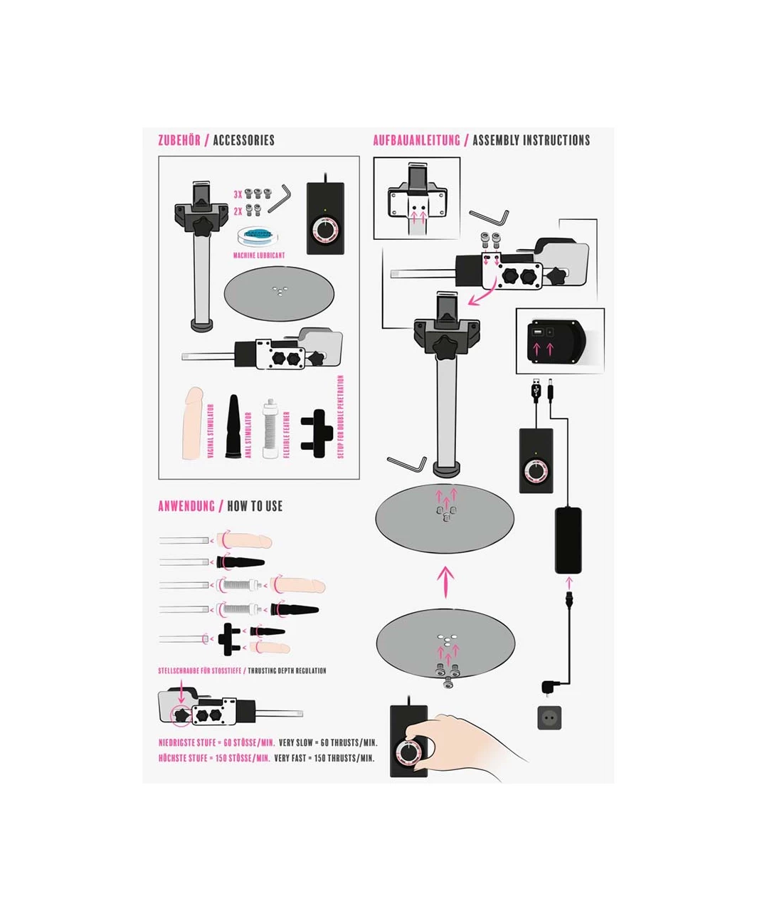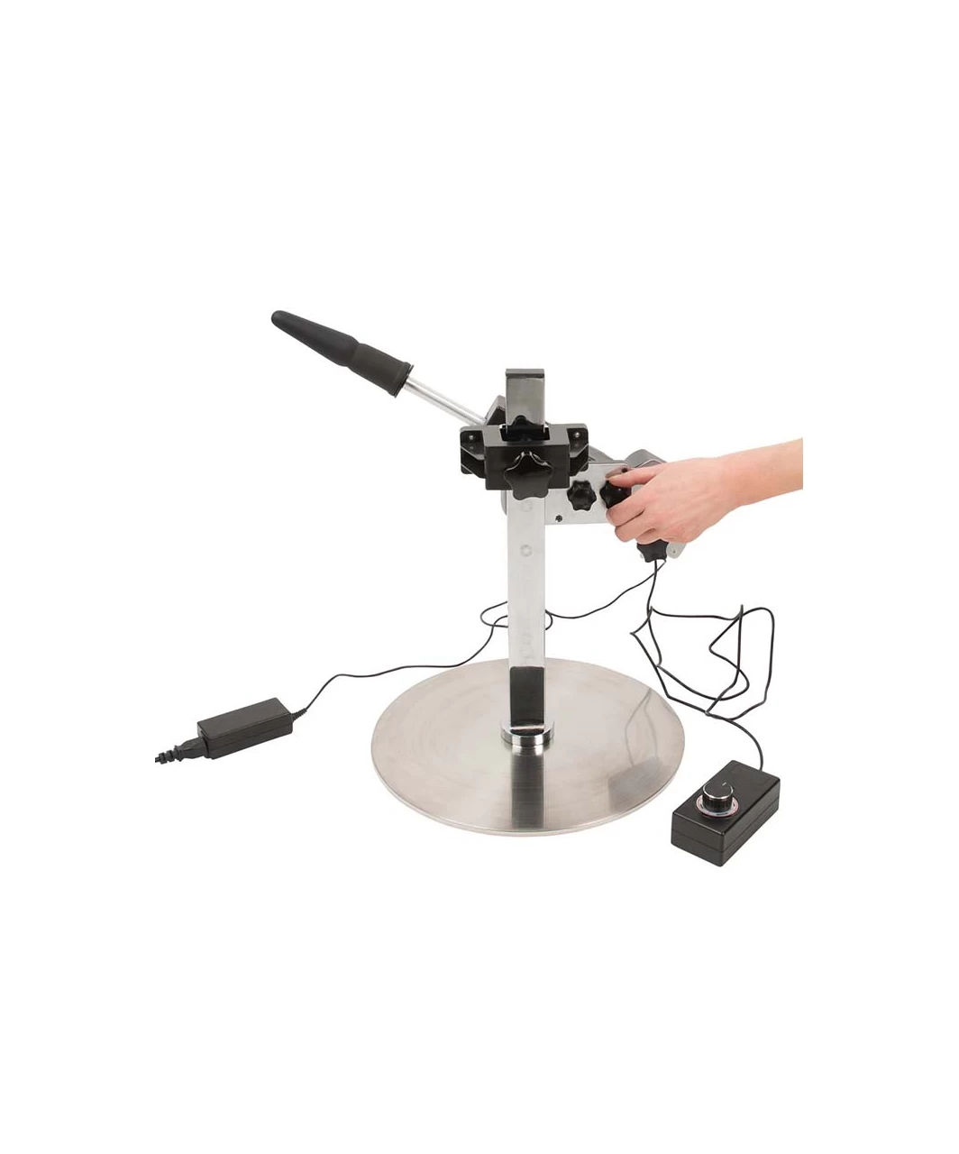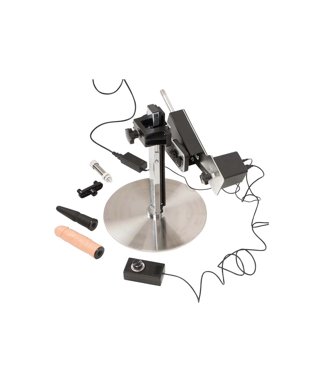 Sex machine with an adjustable stand and two attachments. Can be adjusted via remote control and is rotatable up to almost 360°. It offers up to 150 multi-speed thrusts per minute. Made for hands-free use and in a slim and modern design. 1.5 meters cable length with mains plug (Schuko plug Type F). Attachment for double penetration included.