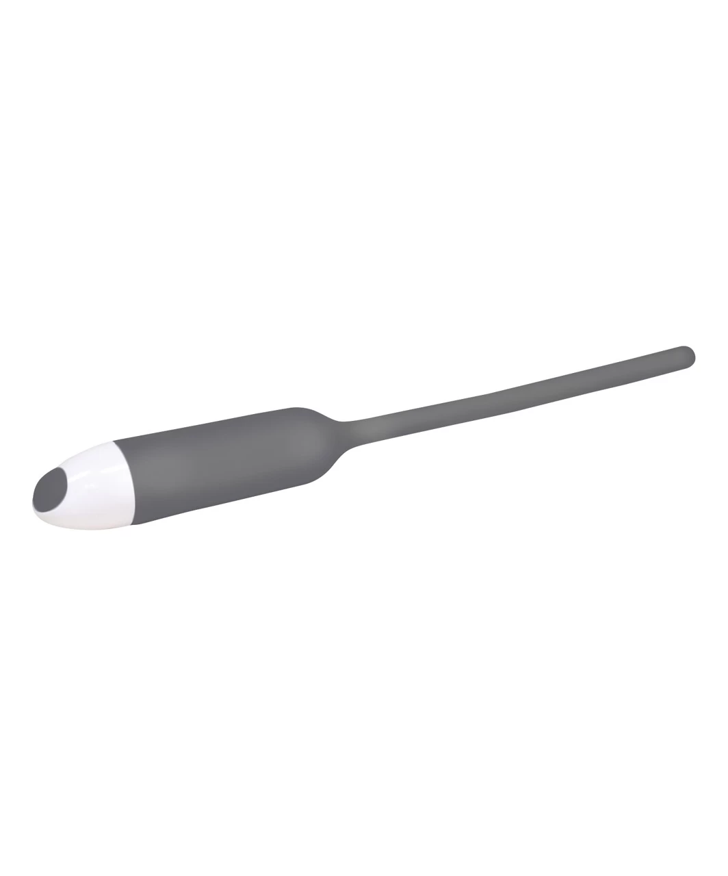 Vibrator for instance applicable for stimulation of the male urethra.With a seamless rounded tip for easy inserting. Slightly elastic. Quiet vibration easily controllable on the push of a button.