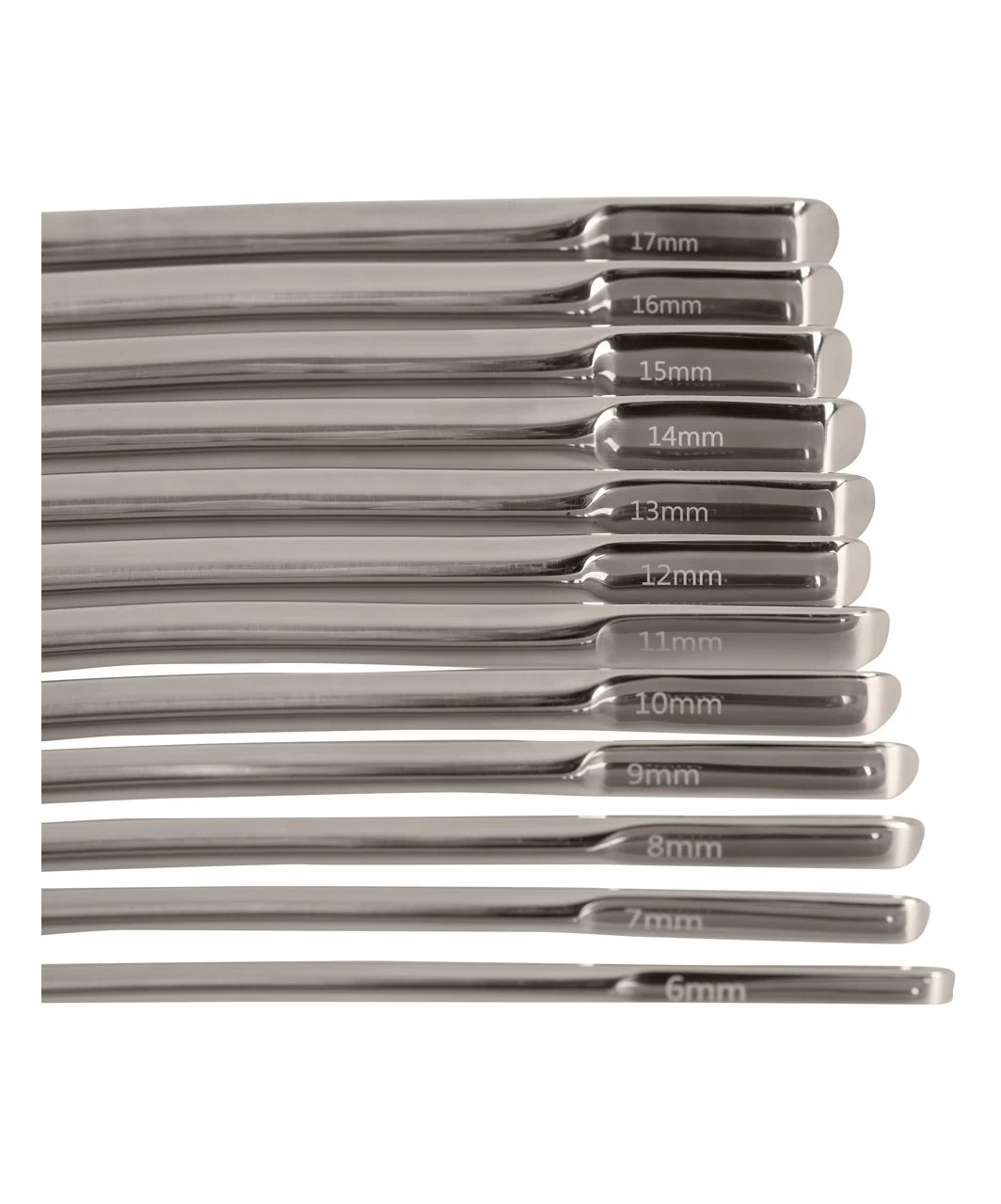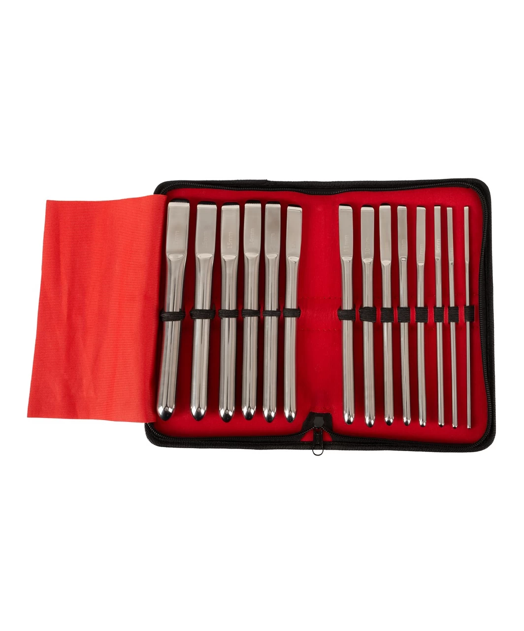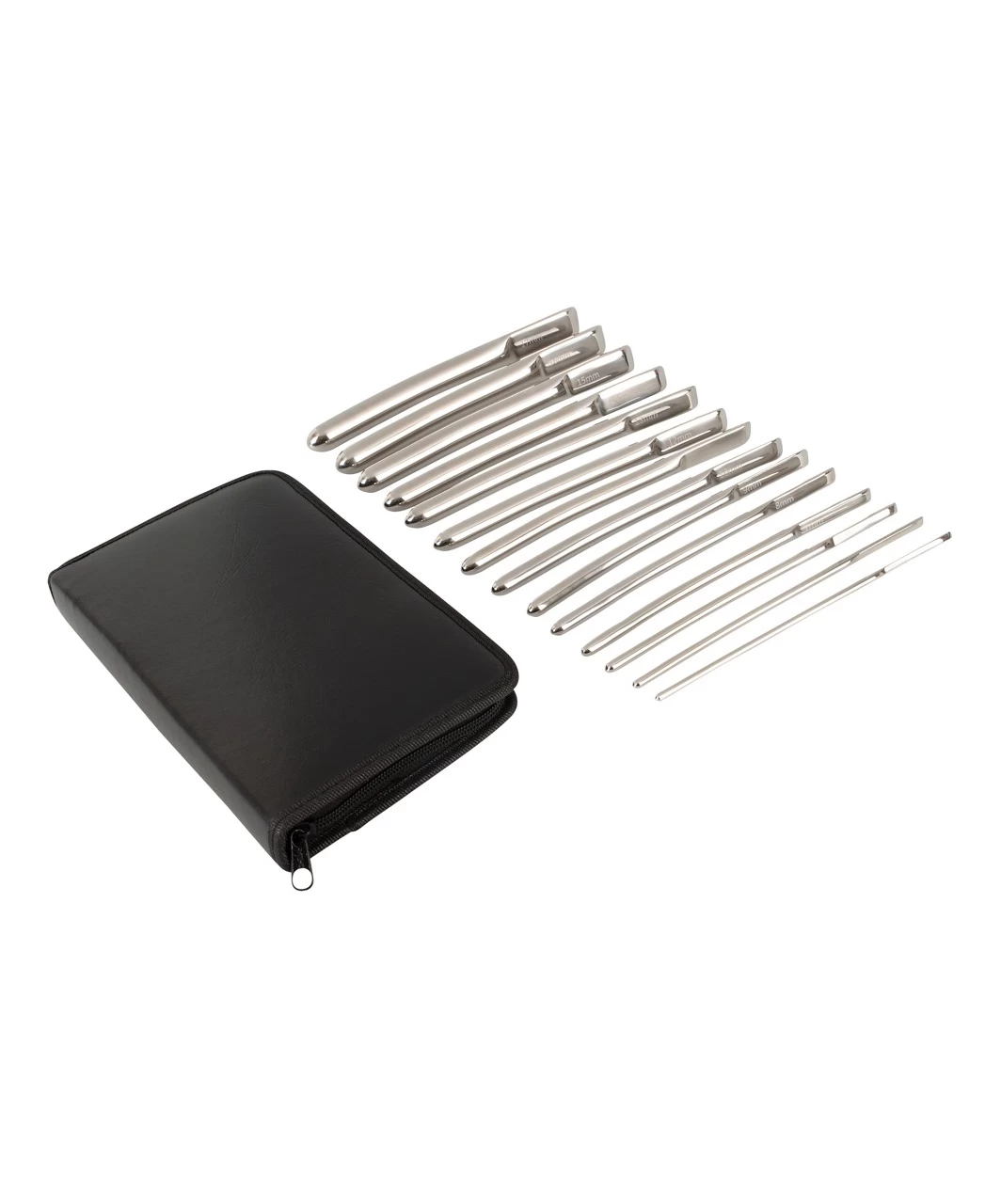 Hegar dilator set with 14 dilators made of polished metal, with round tip and flattened handle. Packed in a black leatherette wallet with a zipper for convenient and safe storage.