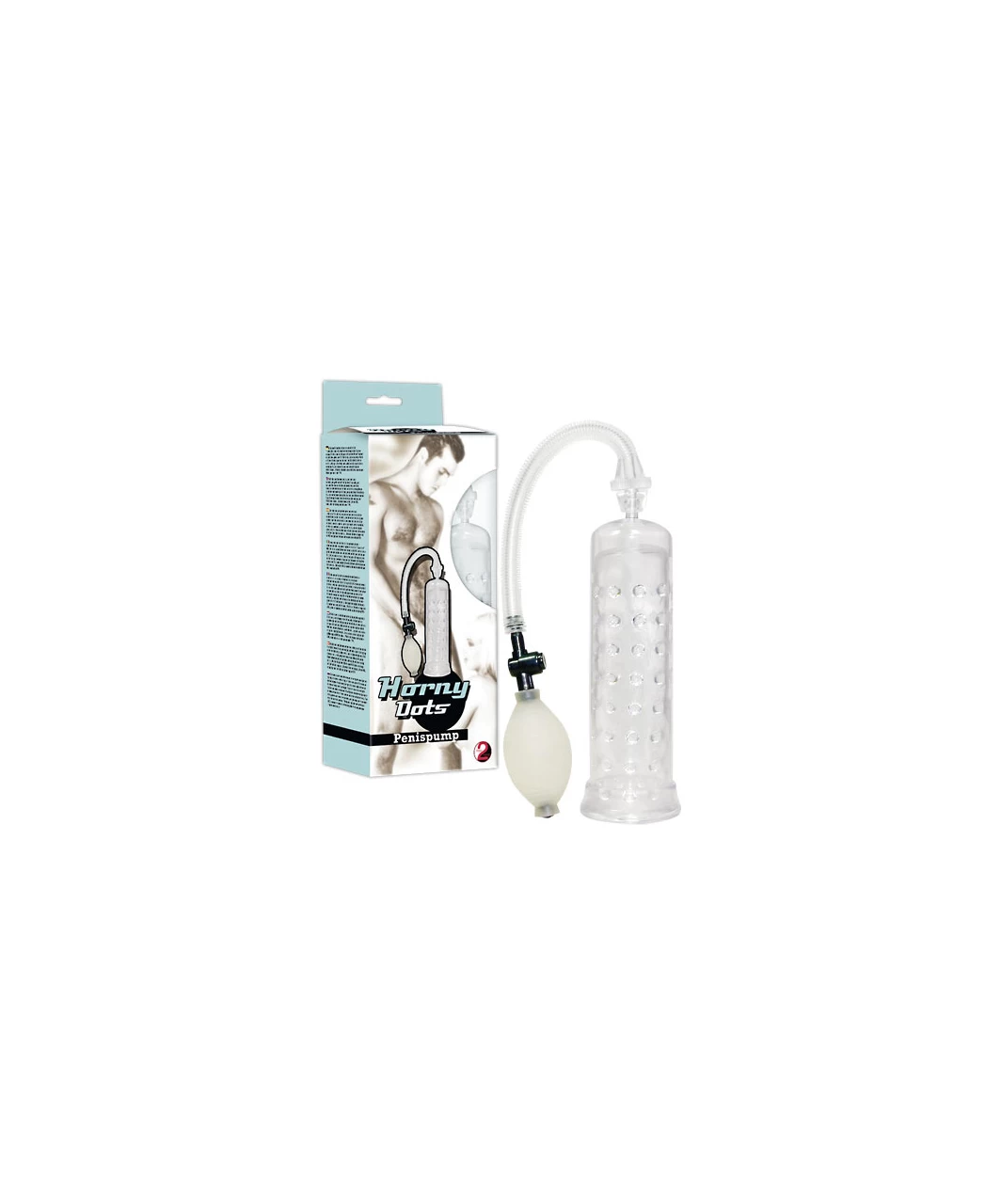 Transparent penis pump with pump ball and outlet valve. Length cylinder 19.5 cm, insertion depth ca. 19 cm. Outer Ø 5.7 cm, inner Ø ca. 4.5 cm. Sleeve removable. Material: PVC, ABS, TPE.