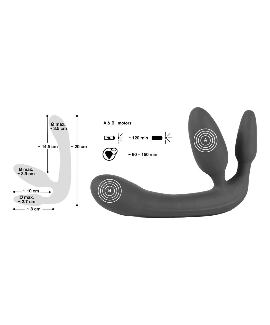 Complete length 20 cm. Vibrator length 14.5 cm, max diameter 3.5 cm.