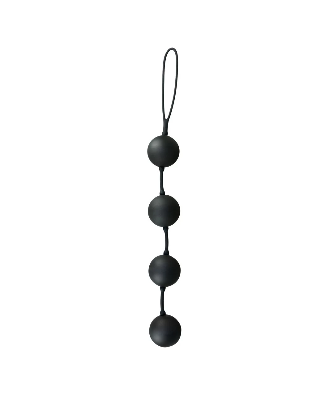 Black love balls made of firm plastic with velvety smooth finish and inner self-rotating balls. Silicone strap with 11 cm long retrieval loop. These balls intended to use just for sensations, not for pelvic floor exercises.