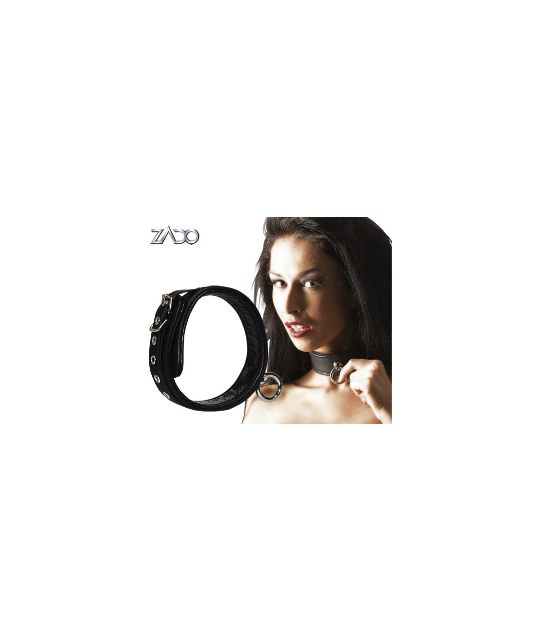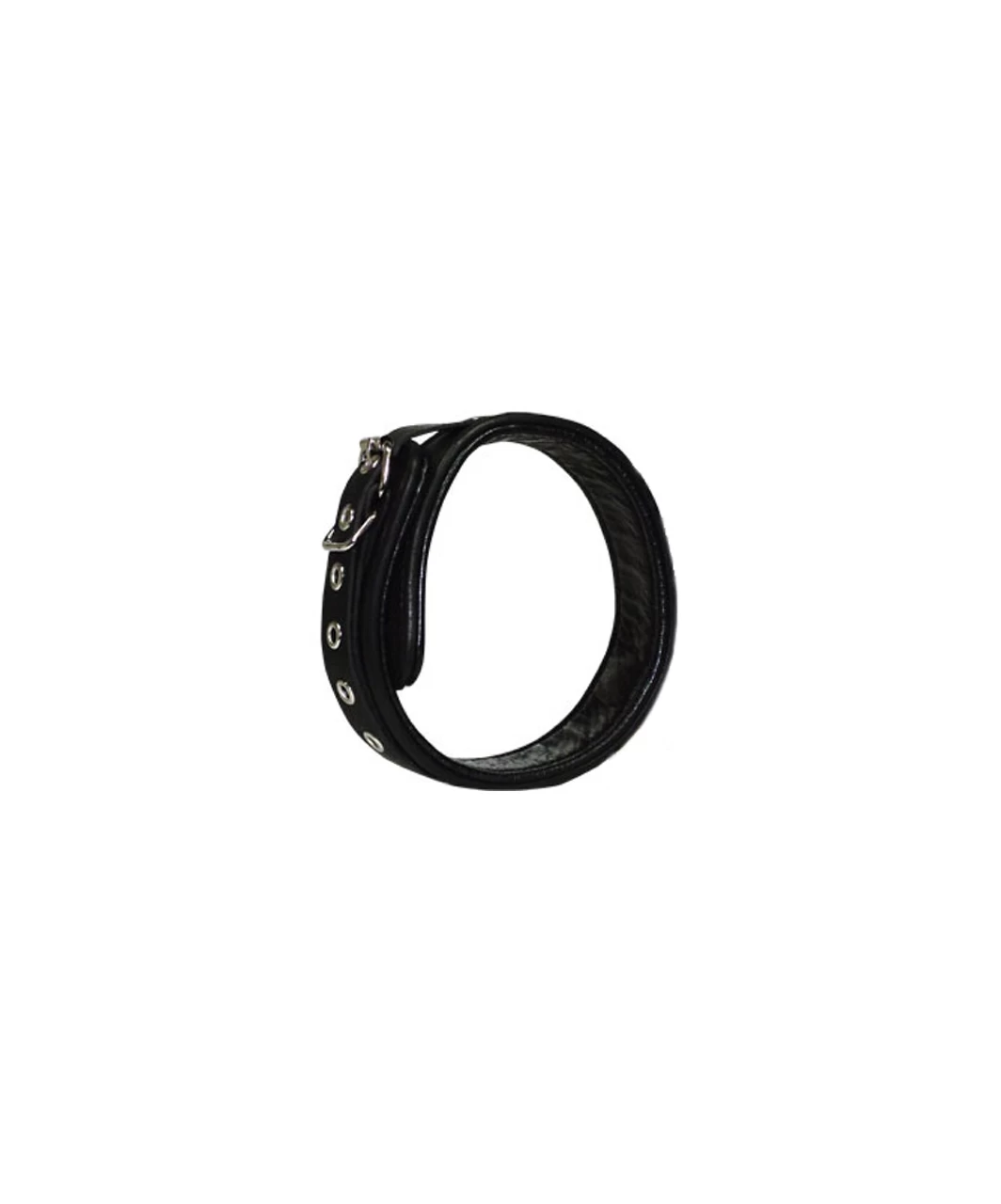 High-quality leather collar with decorative ring in front, 4 cm wide. Length: 45 cm. With adjustable closure: 32-50 cm. Entire collar made of black smooth leather.