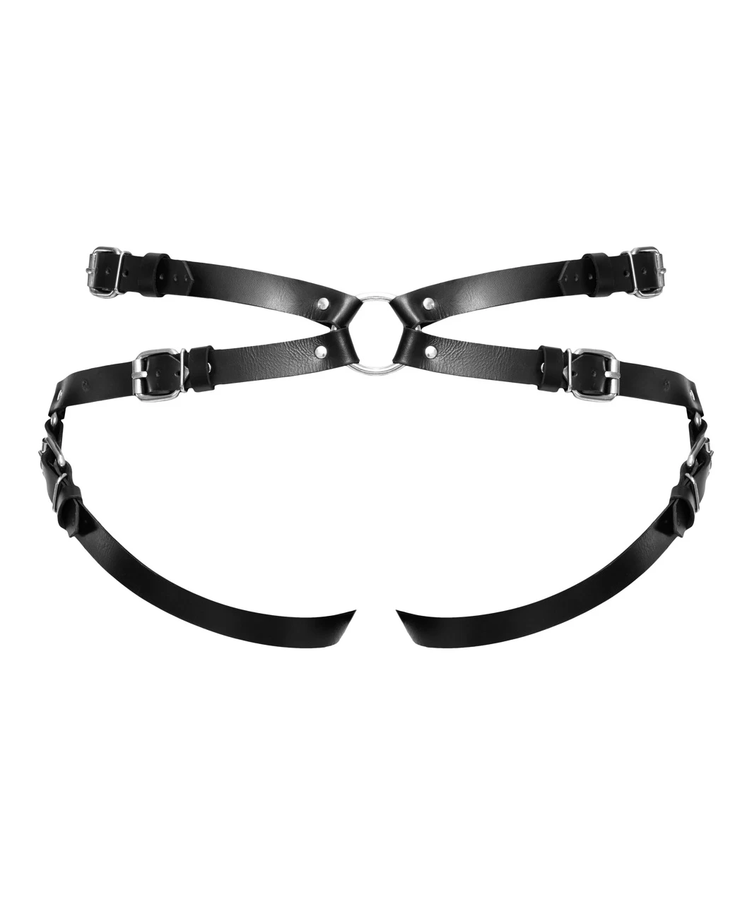Black heavy-duty adjustable strap-on harness made of leather, with two interchangable metal rings as dildo holders. The waist and buttocks straps can be adjusted with belt buckles for a perfect fit. The straps holding the rings has a press stud closures.